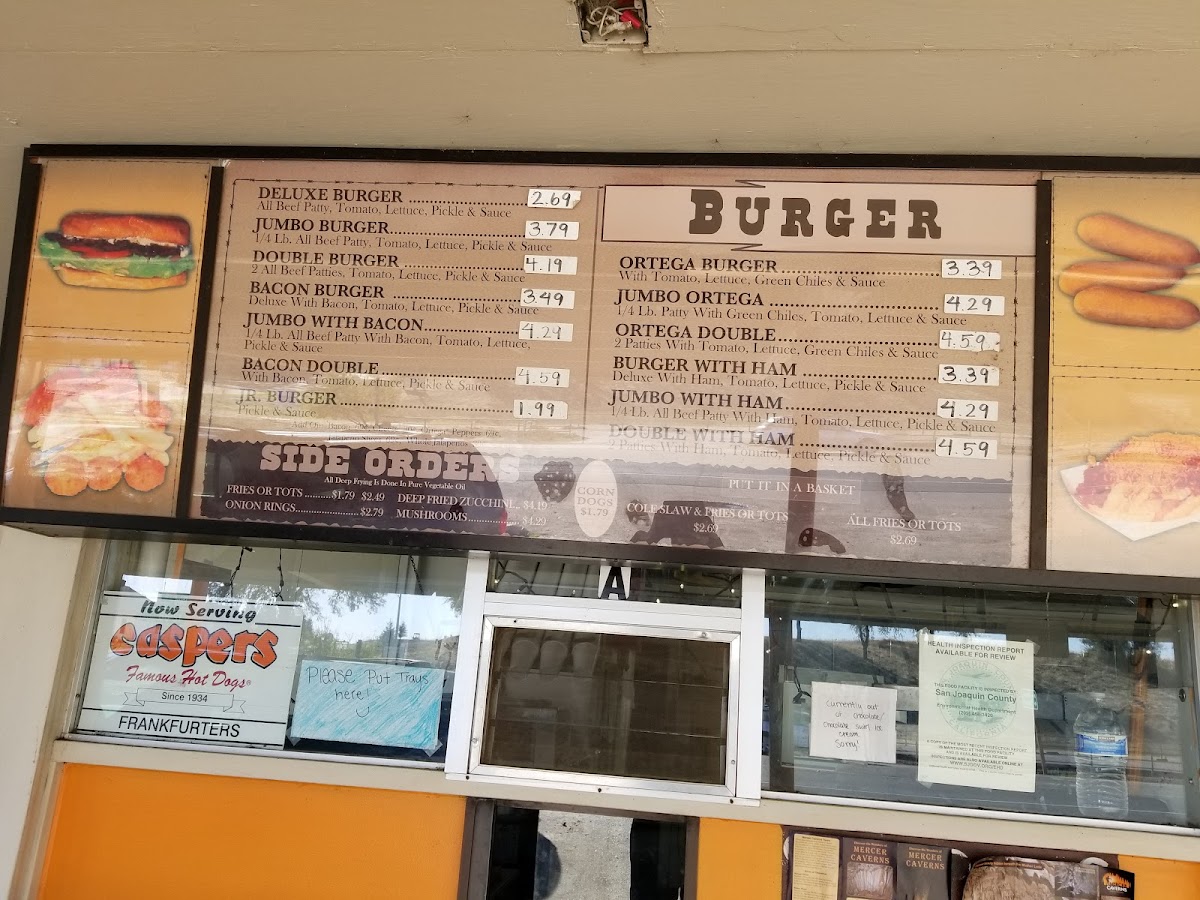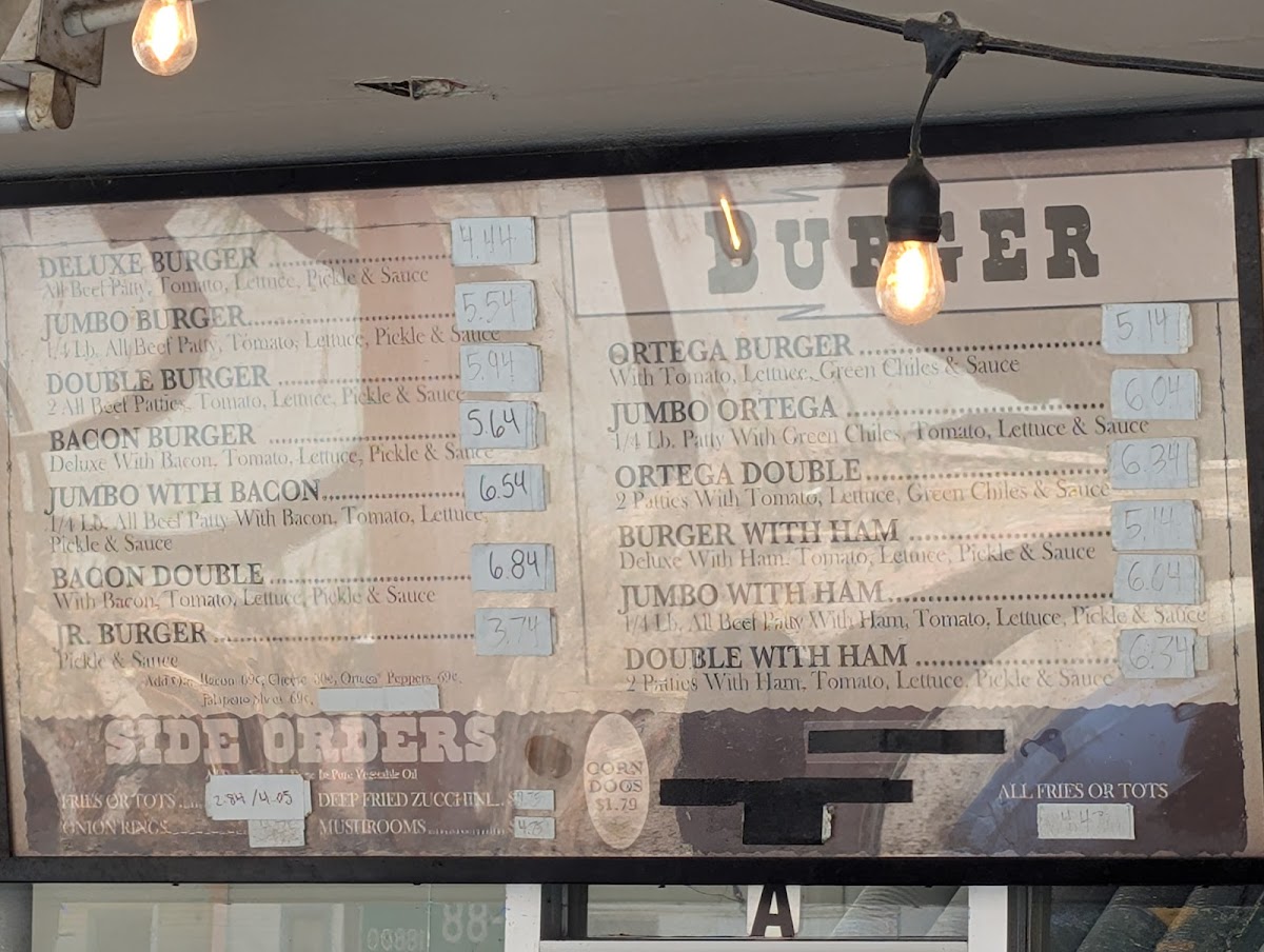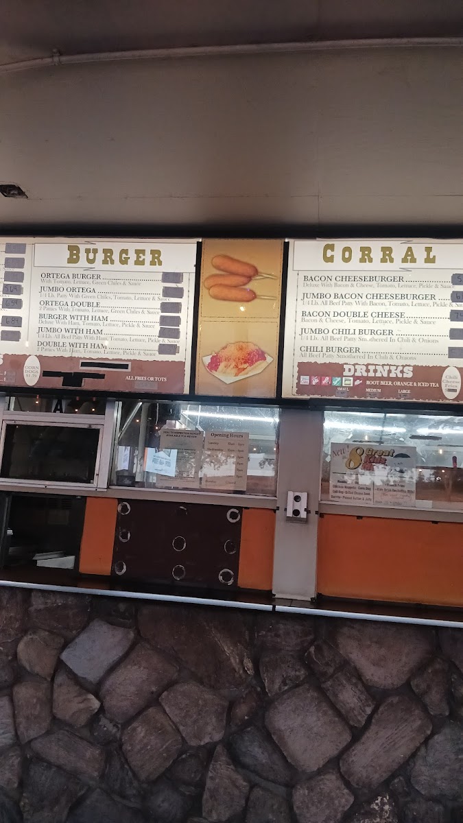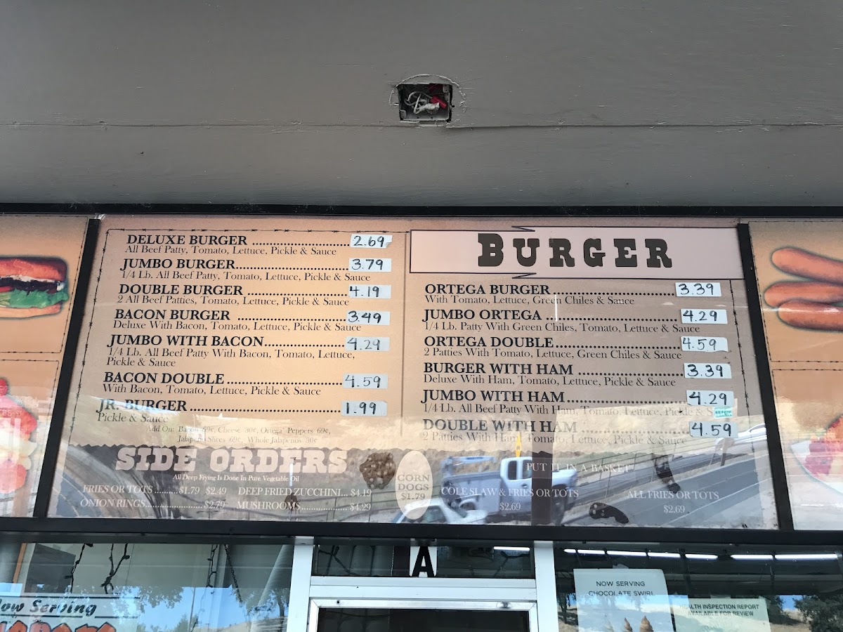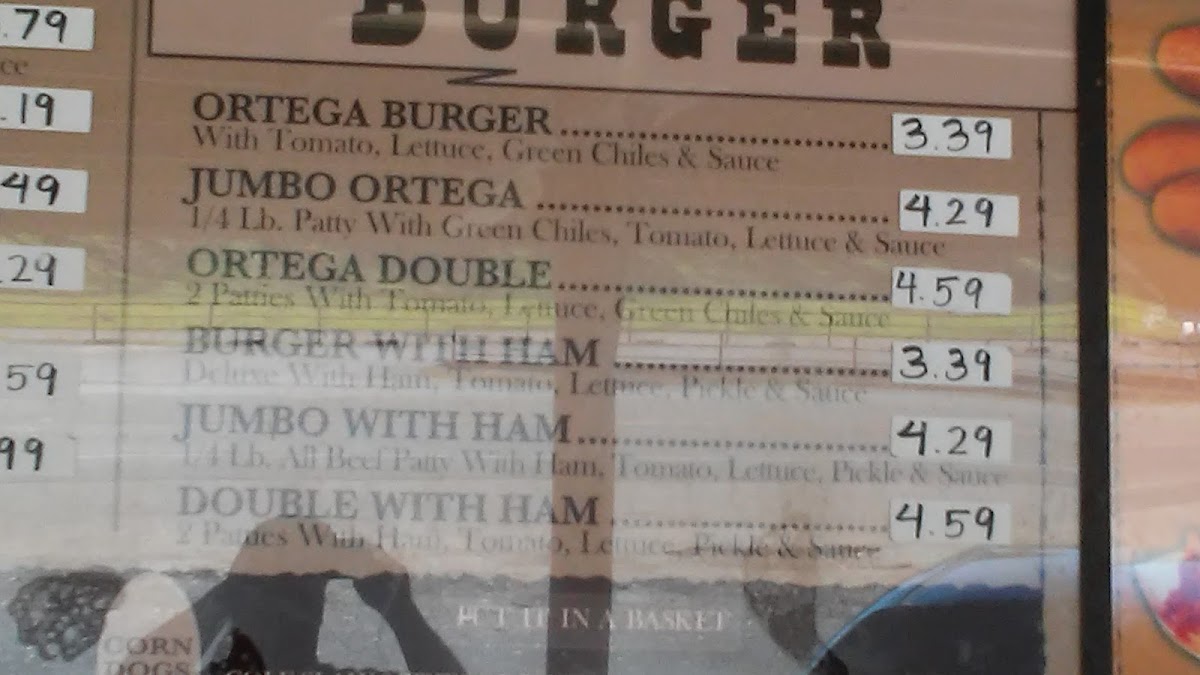 The menu features a variety of classic American fast food items, focusing primarily on burgers and chicken dishes. Visitors can choose from several burger options including standard, jumbo, and double patties, as well as specialty burgers like the Ortega Burger, Bacon Cheeseburger, Chili Burger, and Deluxe Burger. There are also lighter options such as grilled cheese and grilled ham sandwiches.